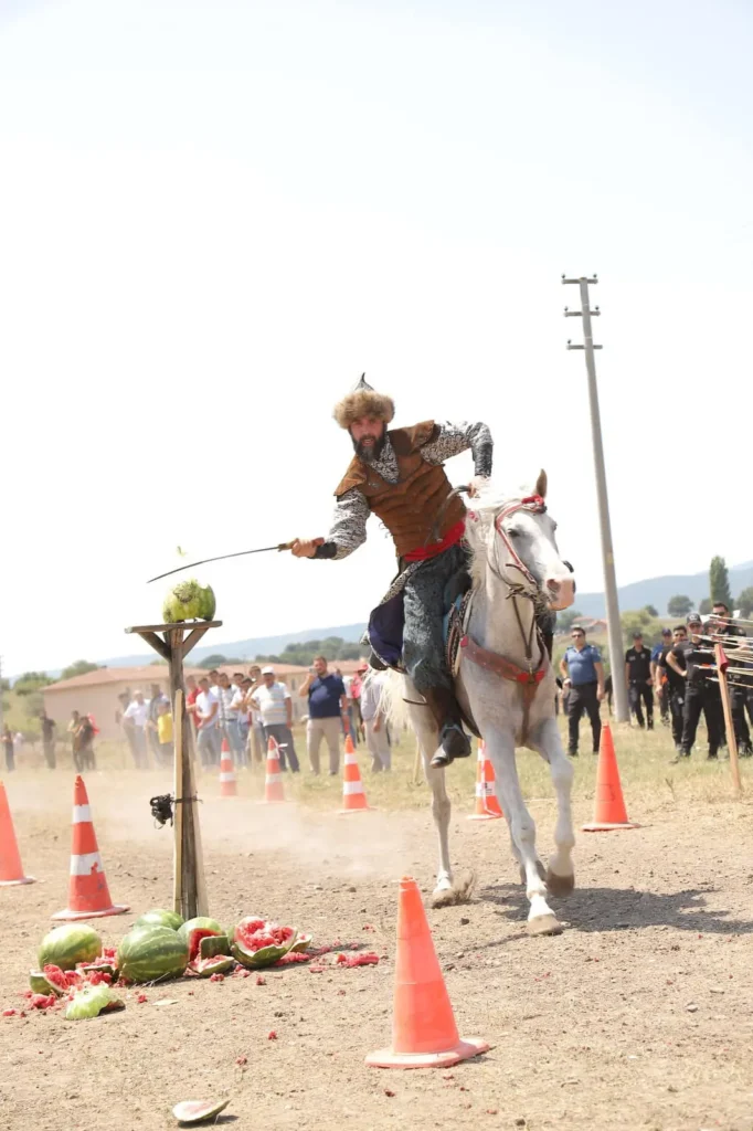Büyük bir çekişme ile geçen Rahvan at yarışlarının sonrasında sahne alan Karesi Atlı Okçuluk Kulübü sporcuları hünerlerini sergiledi. At üstünde kılıç ve oklarla gösteri düzenleyen ekip, izleyicilere heyecan dolu anlar yaşattı.